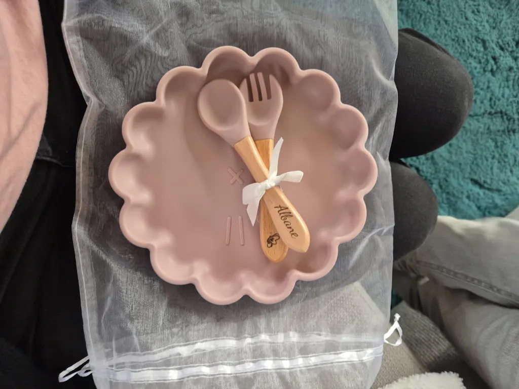 - Une assiette en silicone avec une ventouse pour éviter qu’elle ne se renverse